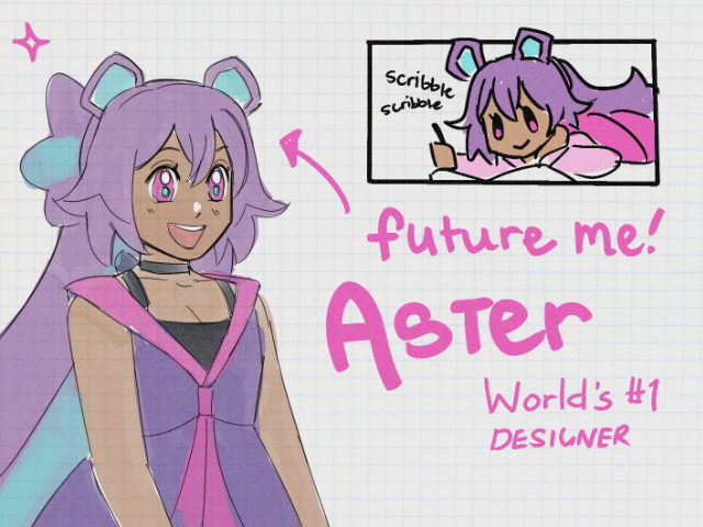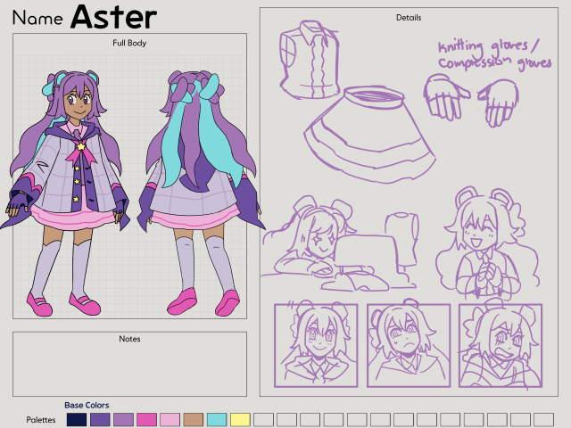 For the new character sheet template, I included a palette section, a notes section and a details section. I also kept it barebones, because ultimately these aren't for posting on social media or anything. They're just for my personal use, lol. I've posted Aster's ref around though because she's cute.