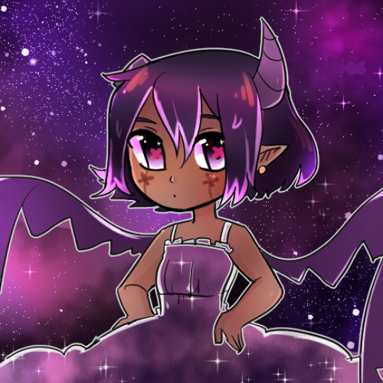 Digital art of a demon character with bat wings. She is surrounded by a nebula.