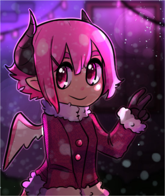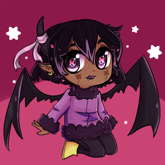 Digital full-body chibi art of a demon character. One horn is broken. She has black bat-like wings.