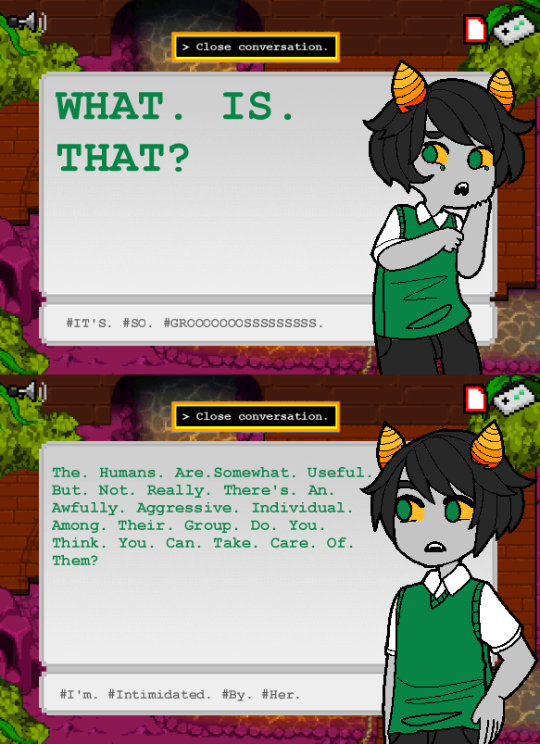In the second screenshot their dialouge is this: The Humans are Somewhat Useful But Not Really. There's An Awfully Aggressive Individual Amoung Their Group. Do You Think You Can Take Care of Them?