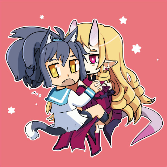 Rutile and Stella from Disgaea 3 are drawing in a chibi style. They're holding hands.