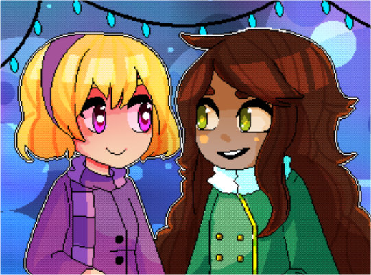 Pixel art of Jade and Rose from Homestuck. They're wearing winter attire. Behind them are christmas lights.