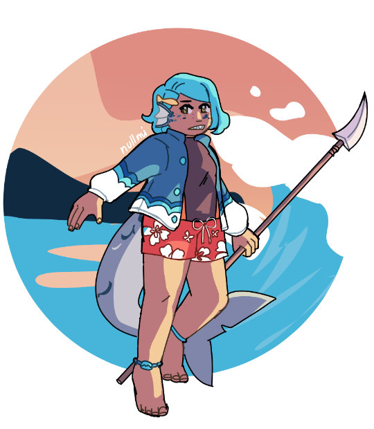 Full body art of Valarie. She as blue hair, a shark tail and is holding a fishing spear. She is dressed in a rashguard and swimming shorts.