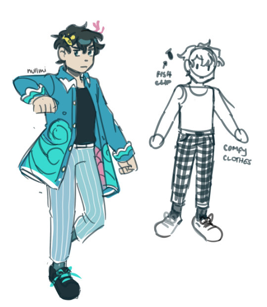 Full body sketch of Ariol. He's wearing a high-color jacket and has black hair. His hair is adorned with branching coral.